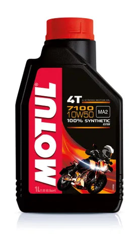 Motul 7100 4T 10W50 is for high performance bikes, sports bikes, street & road bikes, trails, off road bikes, enduro, trial…fitted with 4 stroke engines, integrated gearbox or not, wet or dry clutch, engines meeting Euro 2 or Euro 3 emission regulation, fitted with exhaust gas after treatment systems : catalytic converters, air injection into exhaust pipe.