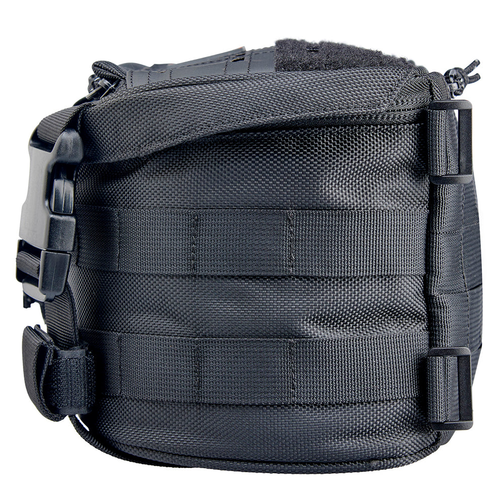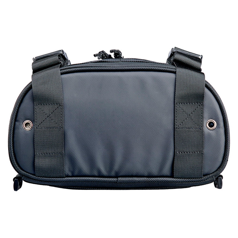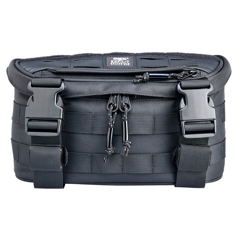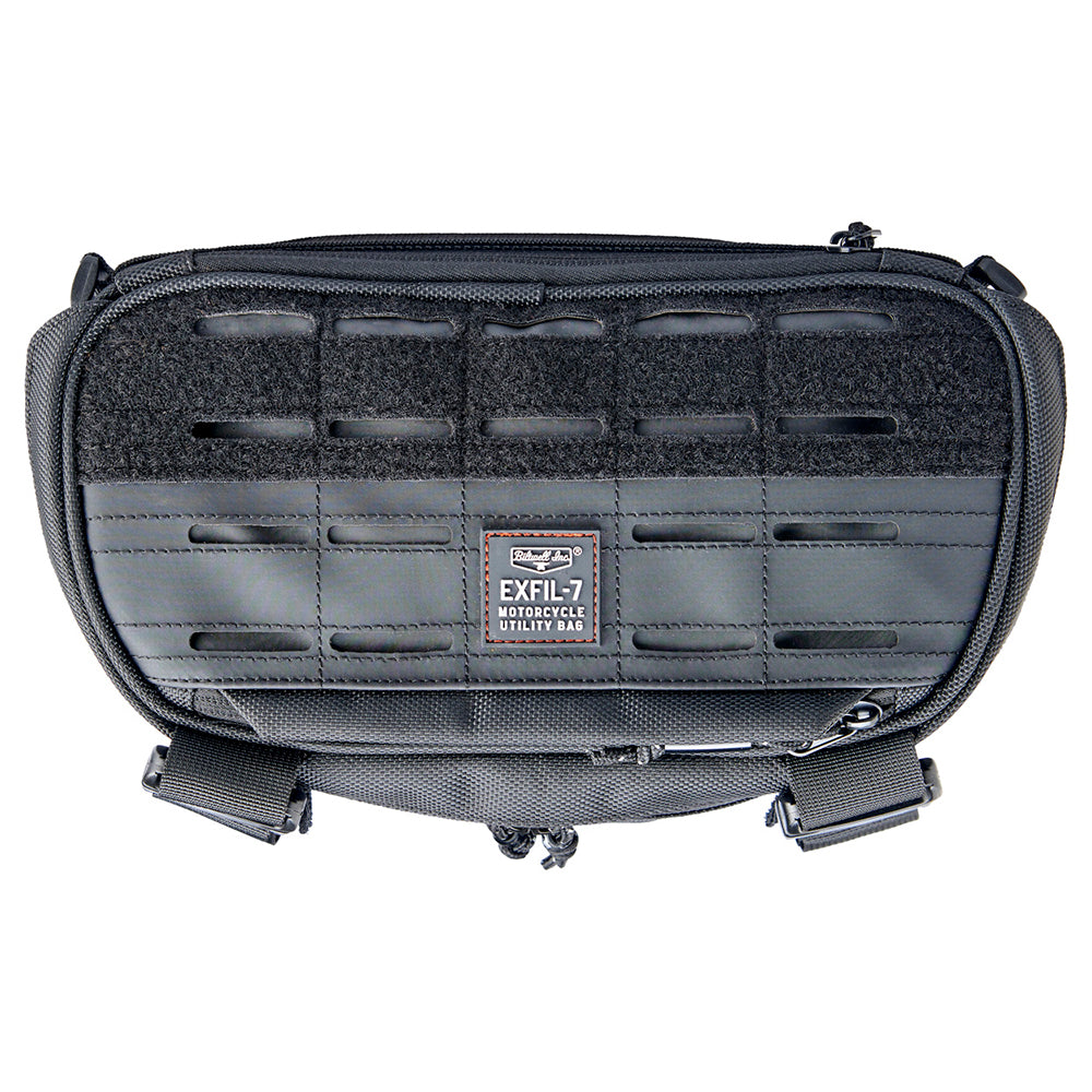 EXFIL-7’s MOLLE strap configuration and four reinforced hook and loop straps easily facilitates a wide range of mounting options. Install the EXFIL-7 bag on your frame’s down tubes, above the headlight, on tall and mid-sized handlebars, and of course on either side of a sissy bar (in front of the taillight and behind your lower back.) Make sure it is securely mounted on your machine and that there is no way it can end up in your wheels or chain. If carrying heavy items, make sure the bag is physically supported from the bottom by resting on a fender, headlight or other solid surface. Above all, use common sense!