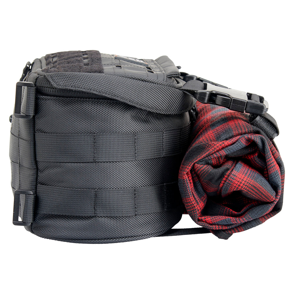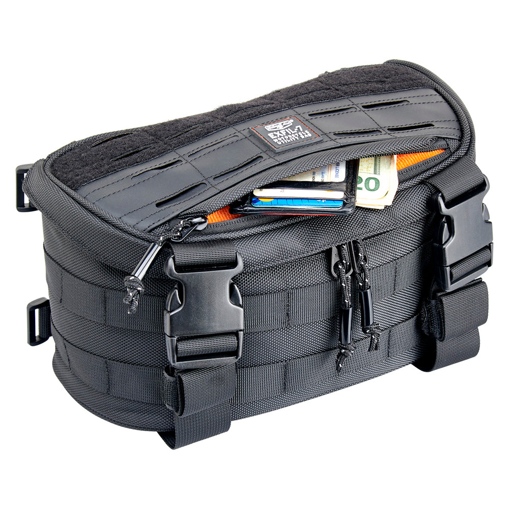 This is the bag that started our EXFIL motorcycle luggage revolution. Now the 2.0 version brings some fine-tuned upgrades. The new lid features lower-profile laser-cut MOLLE slots and a wider zipper opening for the pocket. Four hook and loop fasteners make attaching to your motorcycle even easier than before. All zippers now feature anti-rattle pulls.