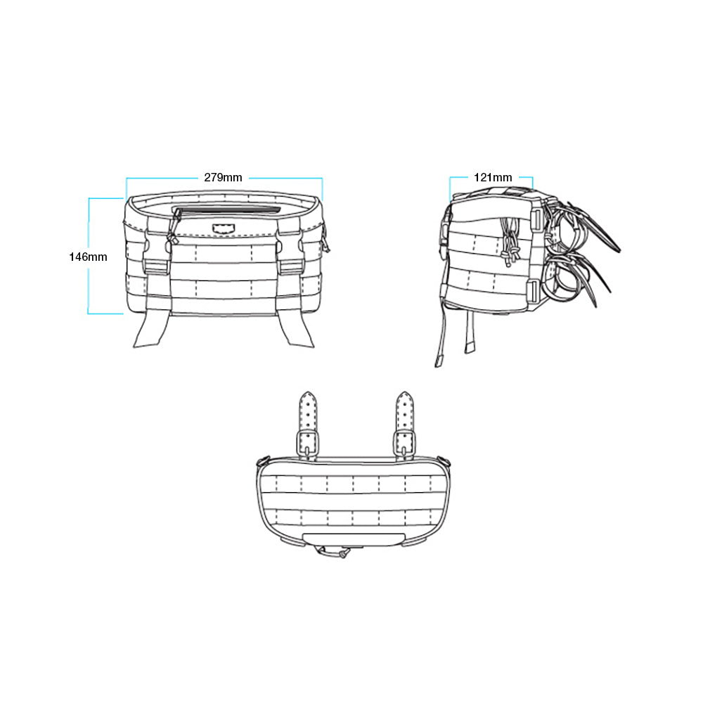 Like all our luggage designs, you can mount EXFIL-7 anywhere. On our personal bikes we've mounted over-stuffed EXFIL-7's on the down tube, over the headlight on tall risers, and on both sides of the sissy bar. A pair of EXFIL-7's will hang perfectly on H-D fender struts to create a set of mini saddle bags. EXFIL-7's MOLLE system and reinforced PVC straps make all these options possible. Once mounted, EXFIL-7 gobbles up personal gear like wallets, pocket knives, phones, tools and other stuff to become the glove box most motorcycles need but don't have.