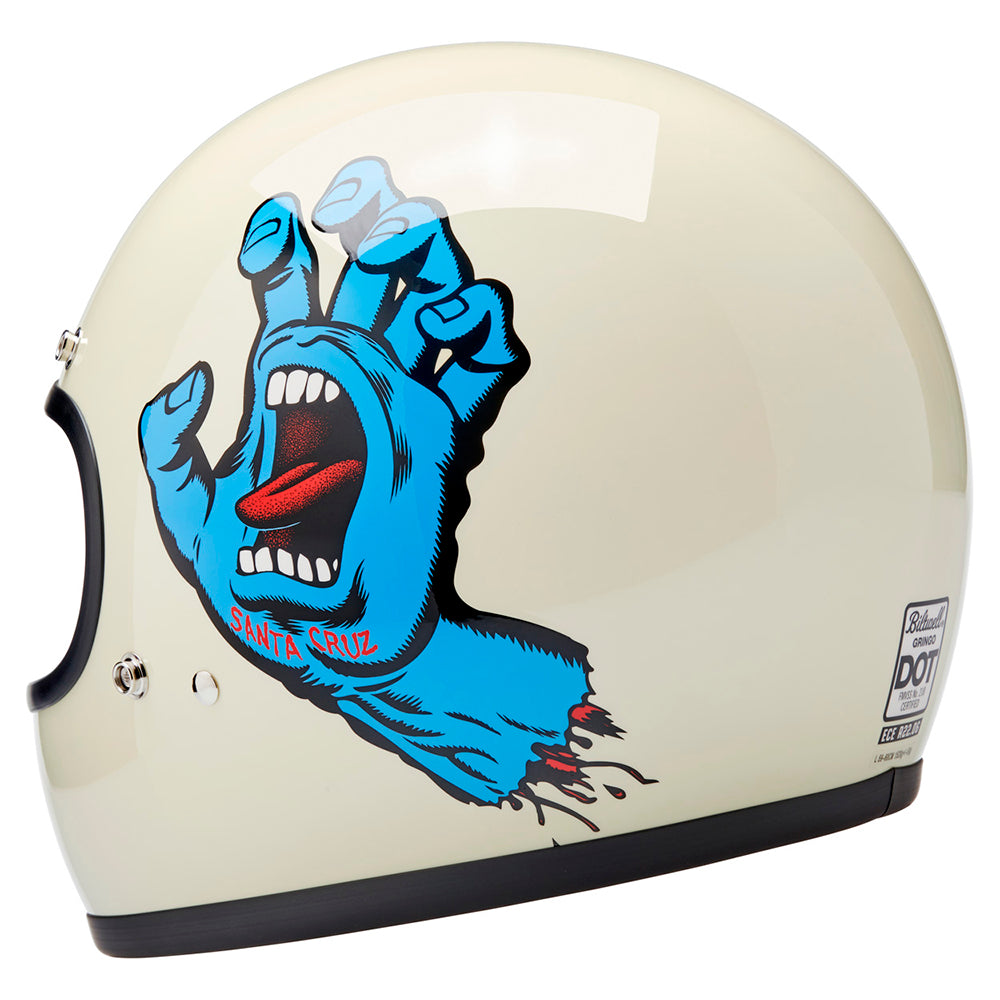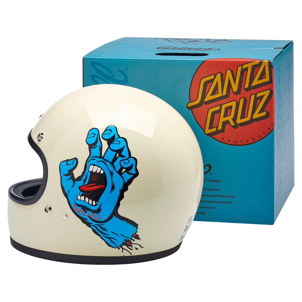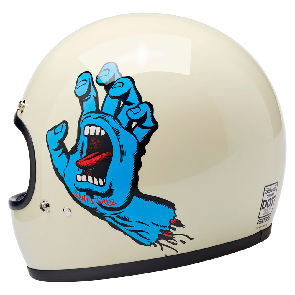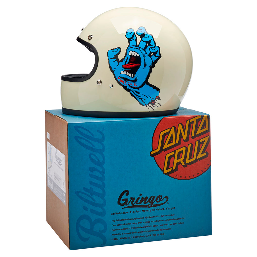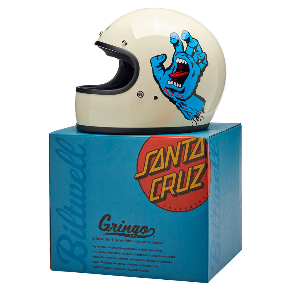 Santa Cruz Skateboards is one of those brands we have looked up to since Biltwell’s founding in 2006. Their mission statement sums it up perfectly “To inspire fans of skateboarding and art by drawing from our past, in the present, for the future…” Created in 1985 by Jim Phillips, the Screaming Hand is one of the most recognizable skate logos of all time and we thought it was the perfect fit for a collaboration on this limited edition Gringo helmet.