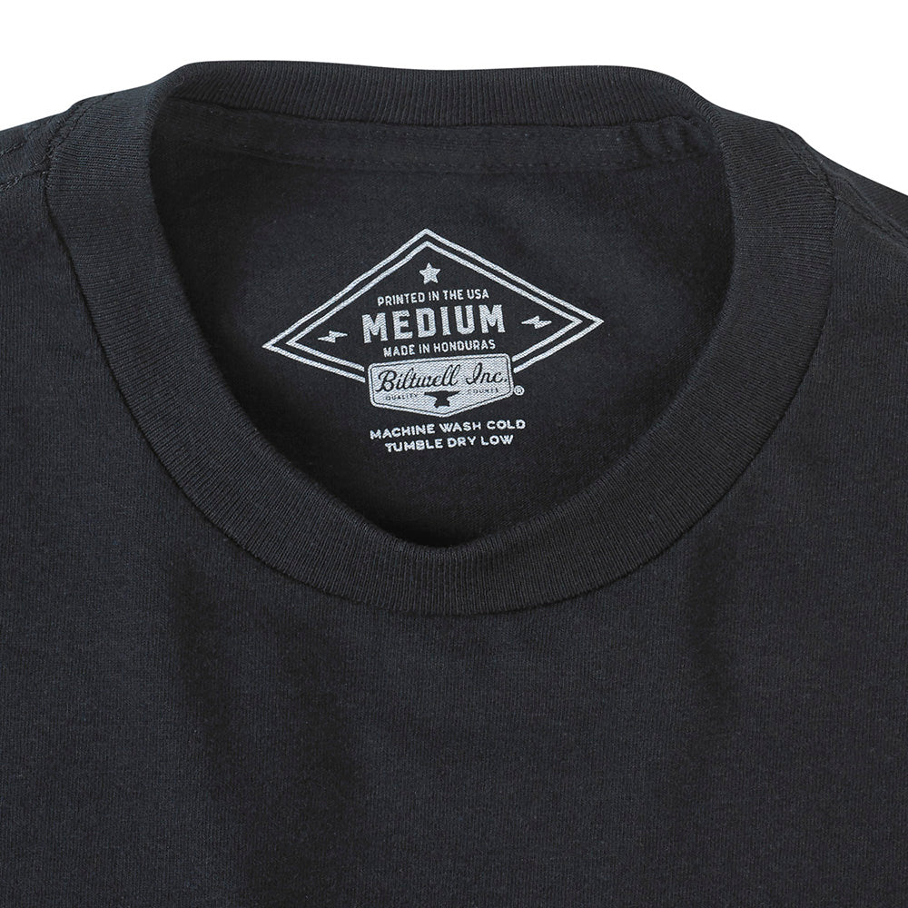 100% pre-shrunk 6oz cotton tee is detailed with hand-screened water-based inks, woven clip tags and the irritating collar tag has been replaced by a screen-printed label.
