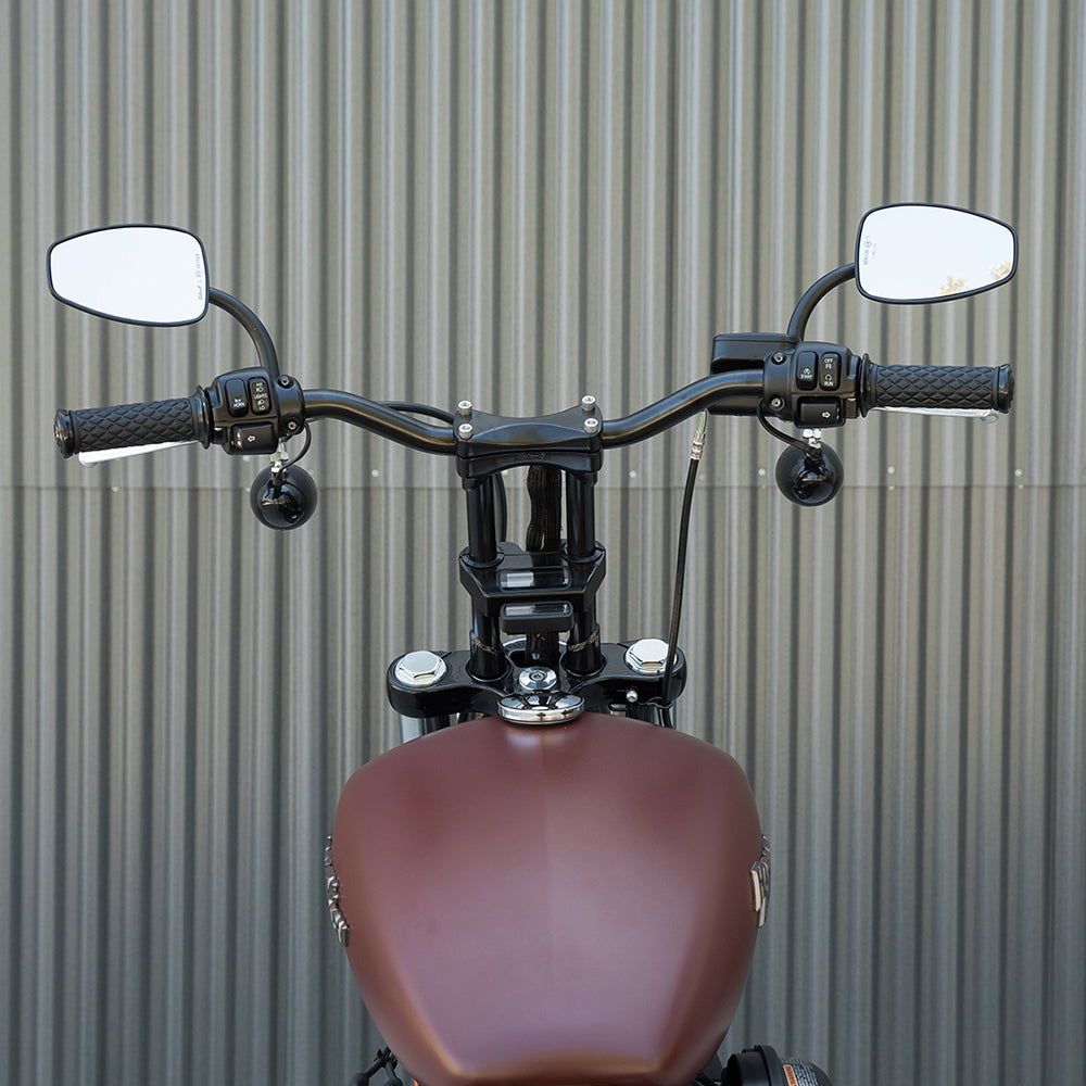 With a backsweep less severe than most stock handlebars, any Tracker in our range is a great replacement for riders who want to ditch the wheelbarrow feel of OE bars. When people ask for our advice on which Tracker to mate with any given Murdock riser, we recommend building a combo that puts your hands slightly below or even with the height of your shoulders when you're sitting comfortably on your motorcycle. Hands higher than shoulder height is popular, but it's a position better suited for experienced riders. If the cables and control wires on your bike prohibit going too tall or wide with your bars, combine our low or mid Tracker with some Slimline or Thunder risers for a clean, race-inspired, comfortable cockpit.