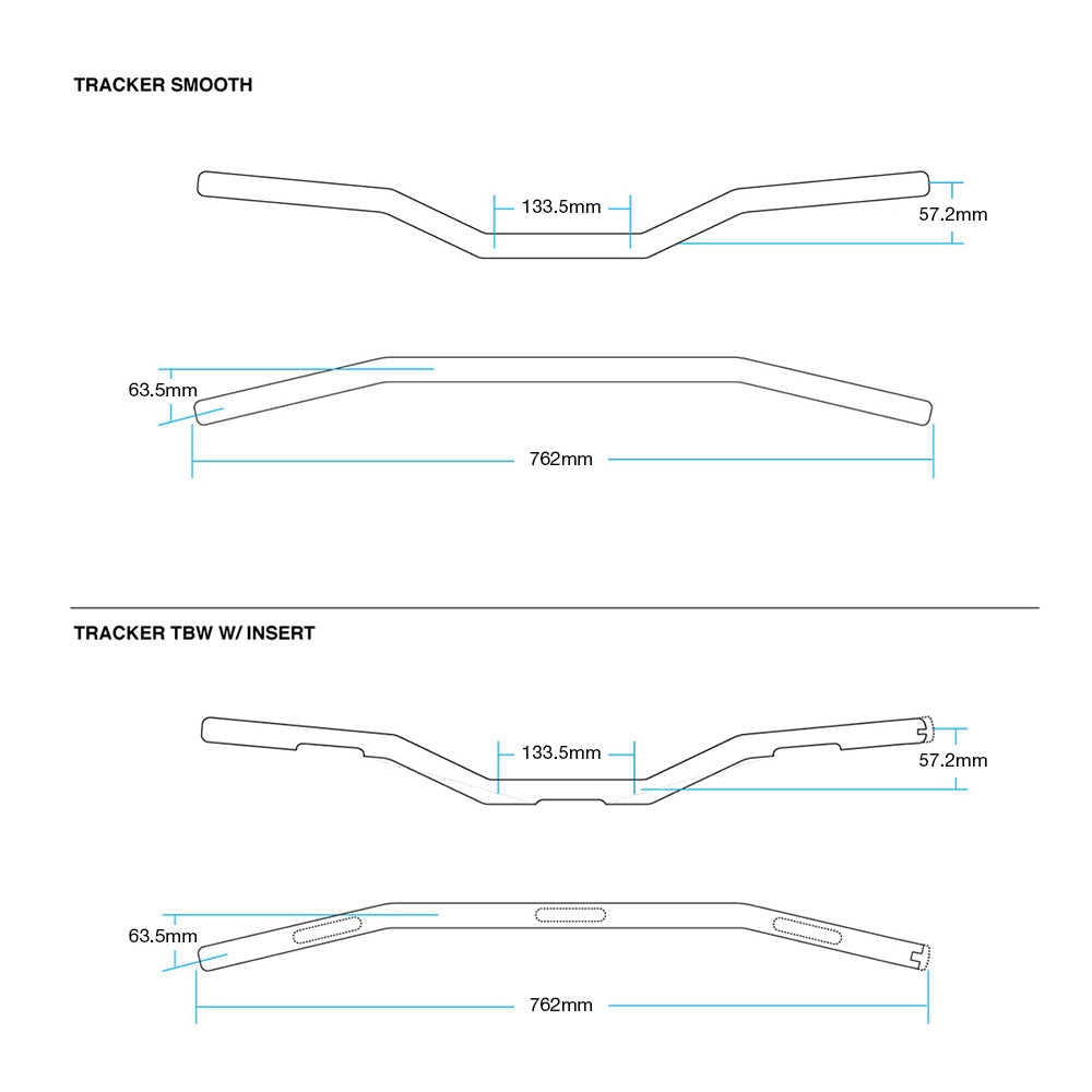 The top-selling handlebar in our range, and for good reason. Our Tracker bars come in two O.D.'s and three heights, and look great in any stock or aftermarket riser you can imagine. These handlebars are constructed with seamless CNC mandrel bent 0.120” wall 4130 chromoly tubes. Available in two styles: Smooth bars are for custom applications and have no slots, dimples or castellated ends. TBW w/ insert handlebars work with regular, cable-operated throttles, and if you remove the black end plug it will accept Harley's Throttle-By-Wire control module. These bars have slots on each side for stock H-D hand controls and an exit slot in the center for internal wiring.