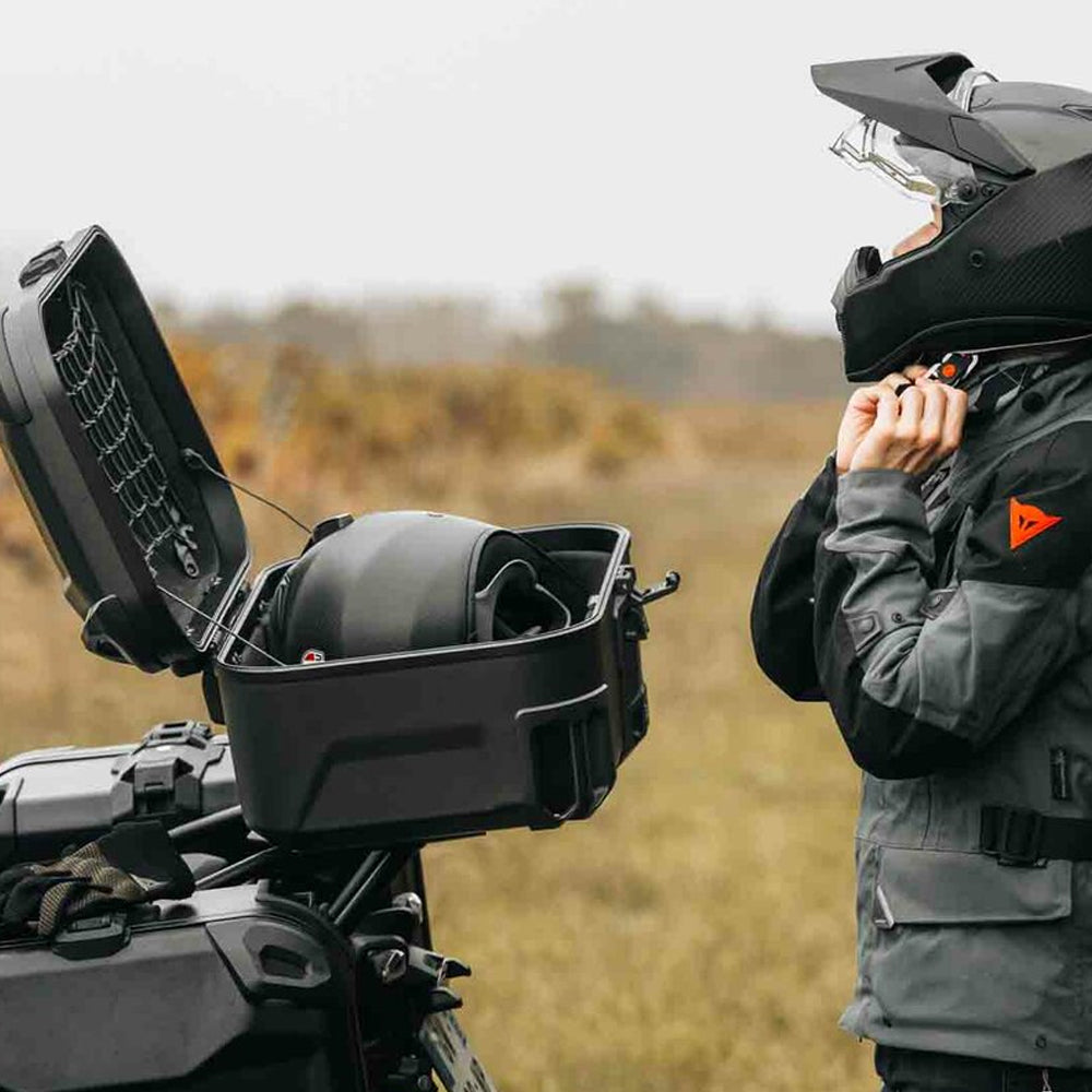 The DUSC XL practically works as a trunk for your motorcycle. It is waterproof, easy to use and offers storage space for everything that needs to be safely locked away during a break – such as helmets, jackets or even tank bags. The passenger seat is always free for a passenger, and the optional backrest provides additional comfort. The DUSC XL features a well-thought-out locking mechanism that ensures your luggage is securely stowed in the case and that the case itself is firmly attached to the rack. Thanks to its compact design, the topcase is no wider than the handlebar, so you remain flexible in city traffic or when maneuvering in tight parking spaces – whether on small bikes or large touring enduros.