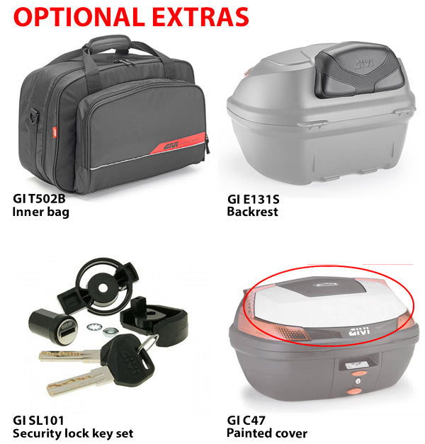 New to the Givi range of Monolock scooter boxes is the B47 Blade top box. The B47 offers an alternative to the classic top box with its racy new shape. Its 47lt capacity means it can hold two open face helmets and it comes with the new Givi hinge system which allows you to close the lid by just pushing on it.