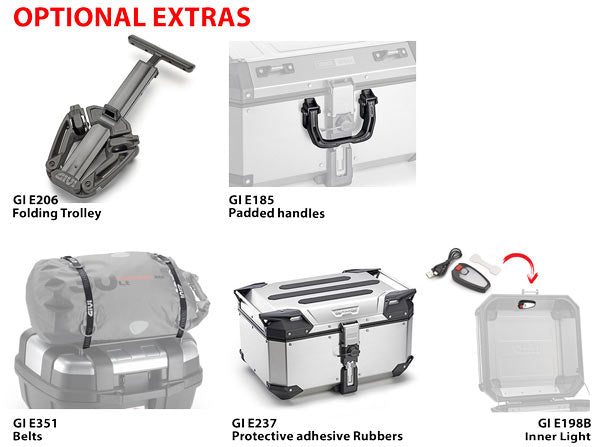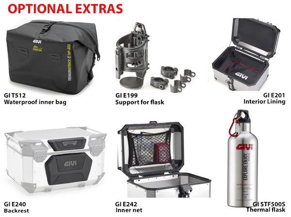 Trekker Outback is the top of the range aluminium touring case from Givi, designed specifically for off-road use. The OBK top boxes can be attached to any existing Monokey plate. The new OBKE58A top case has innovative top and bottom corners featuring eyelets, which eliminate and incorporate the strap loops to make the attachment to the tubular handles more secure. Capable of resisting the bumps and stresses inevitable on off-road journeys, the case comfortably holds 2 modular helmets so you can be ready for any adventure. The new friction rotation system for the lid, Adjustable Resistance Hinge System (ARHS), makes it possible to adjust the closing speed as desired, avoiding any inconvenience while parked on slopes.