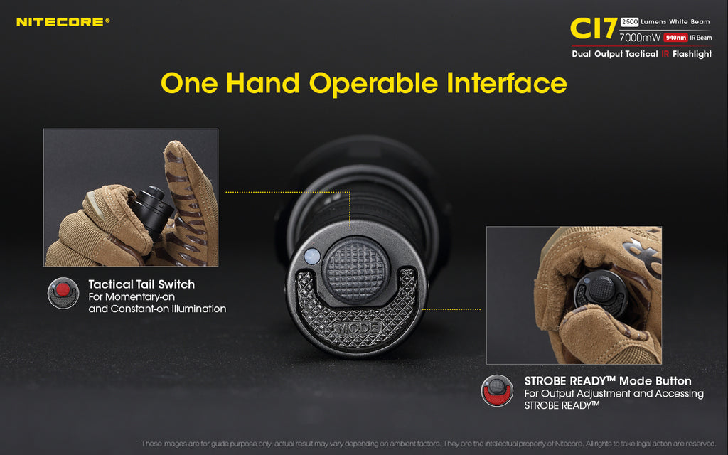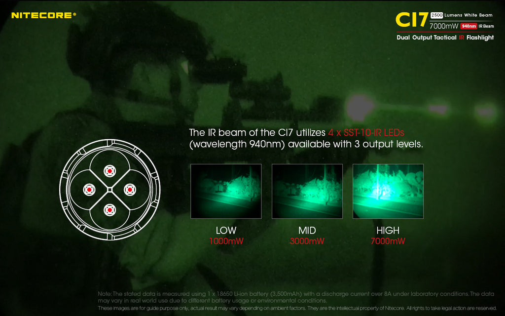 The white beam of the CI7 utilizes 4 x CREE XP-G3 S3 LEDs with a lifespan of 50,000 hours. It can emit a max output of 2,500 lumens and a max throw of 279 meters, ready to meet different tactical needs in all kinds of harsh environments.