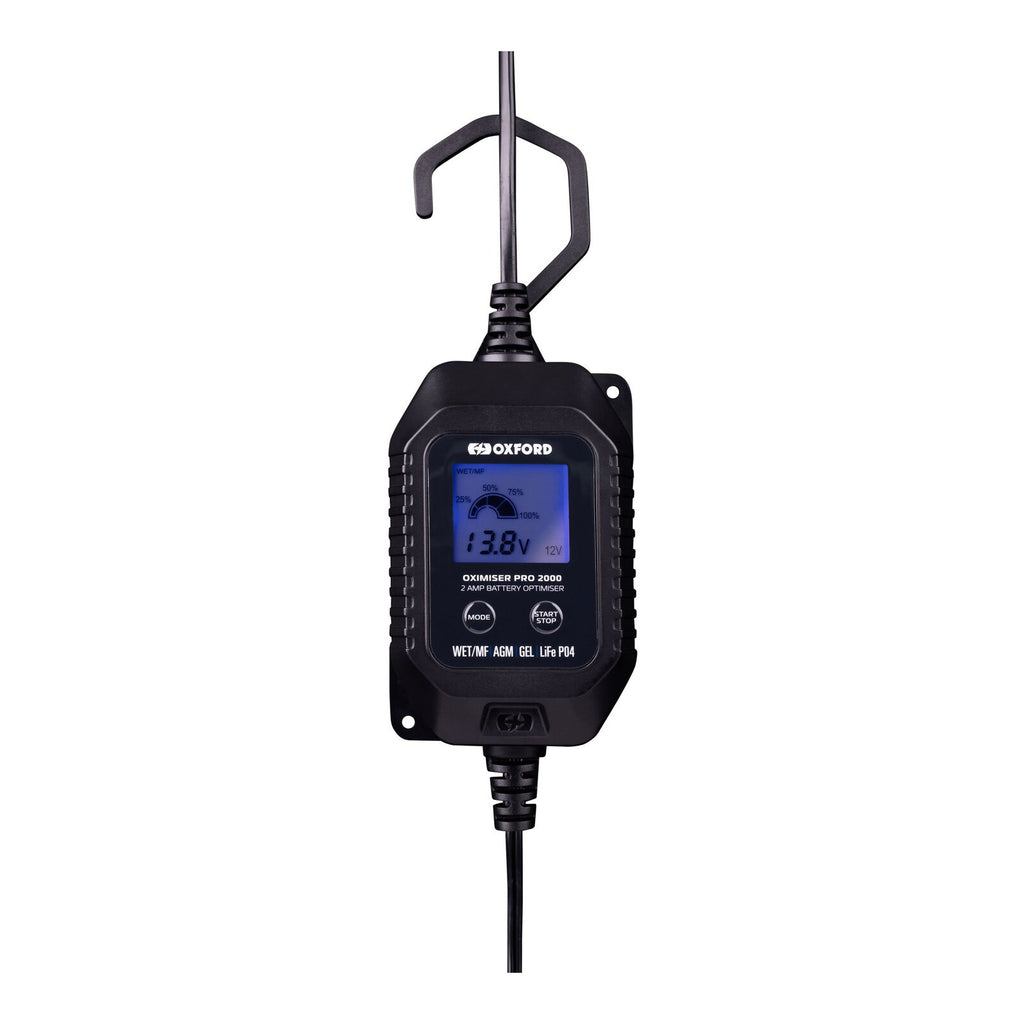 Suitable for use in any environment, the Oximiser Pro's high- impact, fire-resistant ABS casing is ultrasonically sealed to achieve an IP65 rating. The clear, easy-to-read LCD display assists the user throughout the charging stages, and if required, the charger can be lifted off the ground by clipping on a removable hanger.