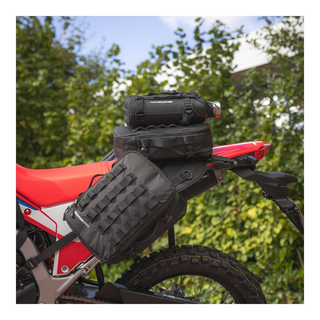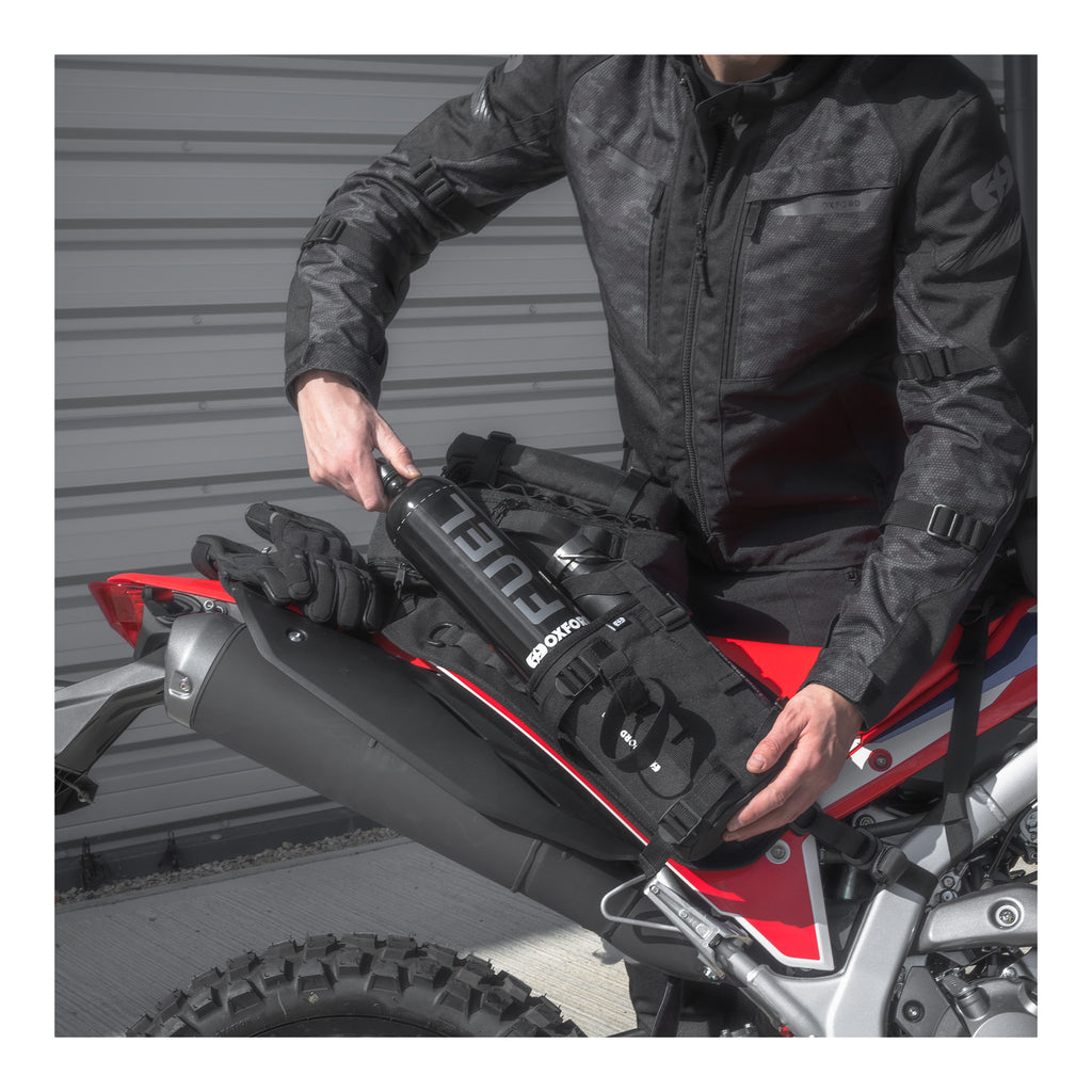 The Oxford Nomad Bottlestash XL is designed to carry two containers; both the Oxford Fuel Flask and the Oxford Aqua Insulated Flask.
