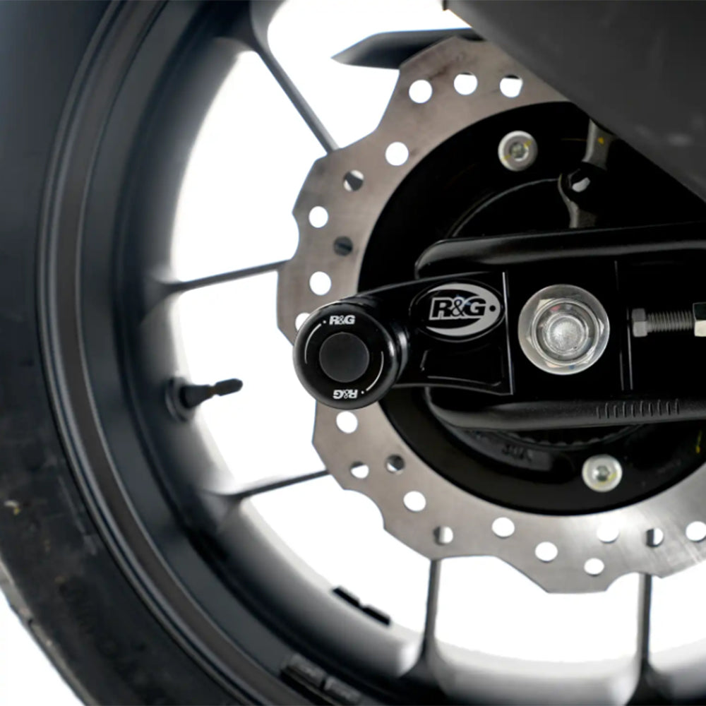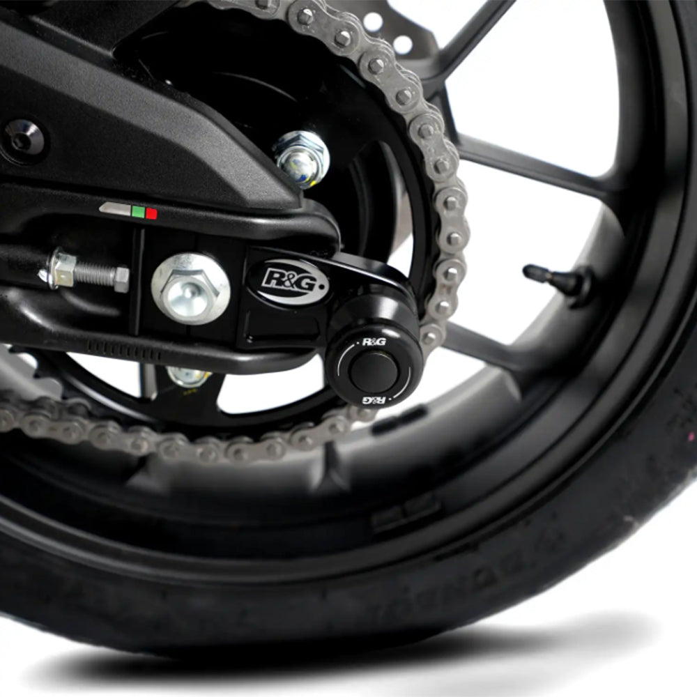Offset Cotton Reels are a mix of R&G spindle sliders and cotton reels, where there is no threaded mounting provision on the bikes swingarm for standard cotton reels. The brackets for the ofset cotton reels are machined from aluminium and replace the standard chain adjusters, and they offer increased protection for the swingarm and core swingarm components from damage in the event of a crash, slide or drop.