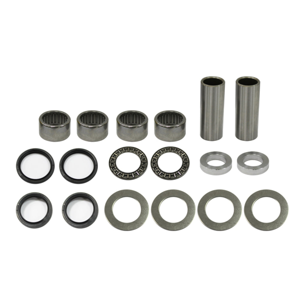 The Whites Swing Arm Kit includes all bearings, seals, shafts, bushings and thrust bearings to completely replace and repair your swingarm bearings. All bearing shafts are constructed from hardened 52100 bearing steel while all steel spacers are case-hardened and plated for durability and corrosion resistance.
